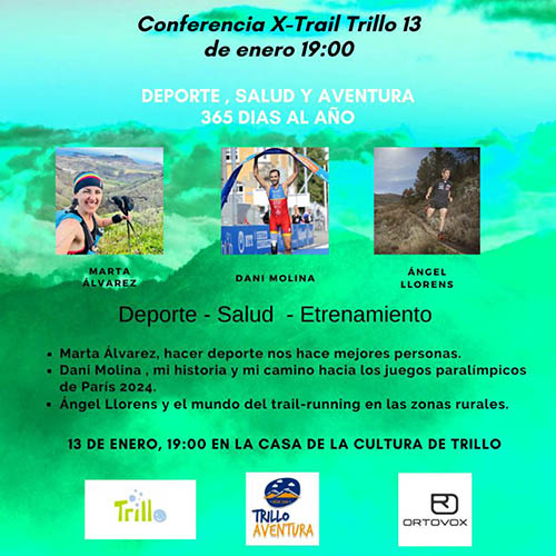 Ya por la tarde, la Casa de la Cultura acogerá la proyección de una película sobre deporte y aventura que dará inicio a las 17.00 horas, y, posteriormente, ya a las 19.00 horas, comenzarán las conferencias. La primera en presentarse será Marta Álvarez, una ciclista polifacética que se atreve con todo, graduada en Ciencias de la Actividad Física y el Deporte y entrenadora personal actualmente, una joven que ya ha visitado Trillo en numerosas ocasiones y que disfruta pedaleando por tierras de la Alcarria. Marta pronunciará una charla titulada Hacer deporte nos hace mejores personas.
