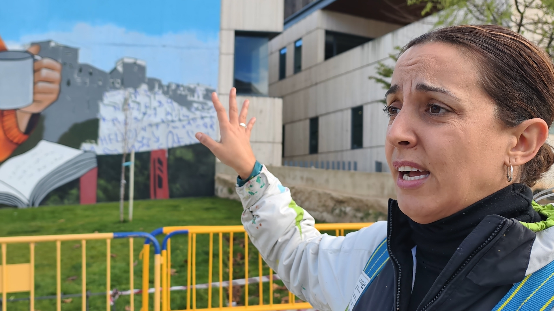 Una obra en la que vemos la imagen de una mujer, leyendo, mientras sujeta una taza de la que asoma parte de la bolsita de una infusión dejando, como fondo, el paisaje urbano que queda a la derecha de las casas Colgadas con el Puente de San pablo. Una obra que nos explica, en el vídeo, Cristina Domínguez Segovia. Una mujer que siente necesidad vital de crear comunidad a través de sus murales.