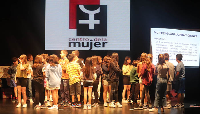 A continuación ya comenzó el que era el eje central del evento: un entretenido concurso de preguntas y respuestas basado en la exposición “Mujeres Referentes de Castilla-La Mancha”, muestra que pudo verse en la localidad entre noviembre y diciembre pasados, y que en los últimos meses estos niños y niñas han trabajado en las aulas, conociendo las trayectorias de una treintena de grandes mujeres de la historia de la región. Conducido por las trabajadoras del Centro de la Mujer Ana Rosa Quintana, Marta Layna y Pilar Hernández, el concurso subía al escenario a 21 equipos de niños y niñas, en grupos de cinco o seis equipos, y entremezclando en cada equipo a estudiantes de los tres centros, niños y niñas. A cada equipo se le realizaba una pregunta relacionada con las mujeres estudiadas, y los “peques” tenían 30 segundos para ofrecer la respuesta correcta. Cabe reseñar que todas las preguntas formuladas fueron contestadas correctamente, lo que demostró el concienzudo trabajo realizado en los tres colegios en esta dinámica.