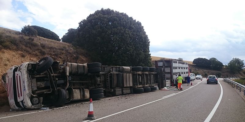Un camión que transportaba cerdos ha volcado hacia las 10 horas de hoy jueves en la carretera N-420 a escasos kilómetros de Fuentes sin que haya habido que lamentar daños personales.