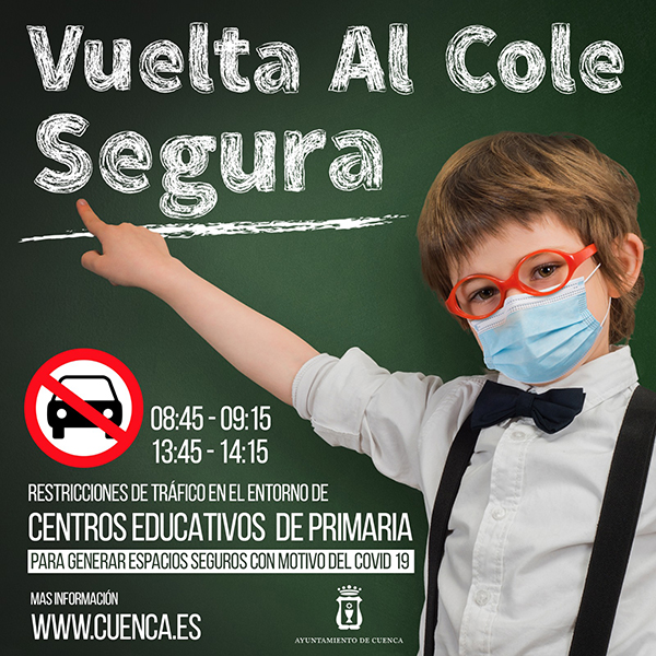 8,45 a 9,15 y de13,45 a 14,15 horas (en septiembre de 12,45 a 13,15 horas por período de adaptación) se producirán restricciones de tráfico en el entorno de los colegios de la capital. En el apartado de Incidencias de la web municipal (www.cuenca.es) se pueden consultar las calles a las que afecta.