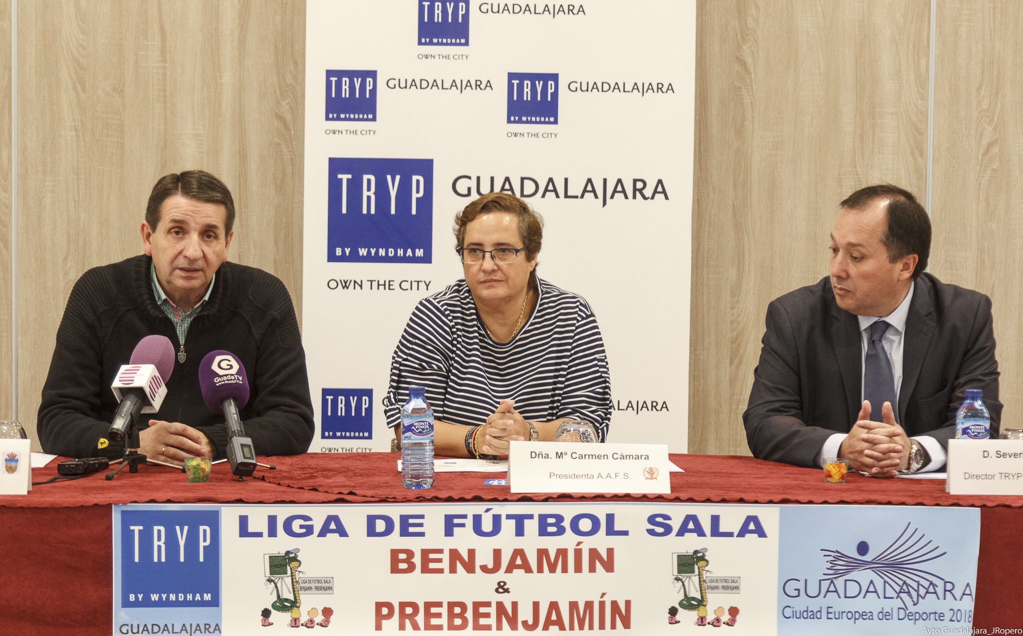 Eladio Freijo, concejal de Deportes, ha comparecido acompañado por Severino Castro, director del hotel Tryp Guadalajara, patrocinador de la liga y “primera de las empresas que se suma a colaborar con el Ayuntamiento tras su elección como Ciudad Europea del Deporte 2018”, tal y como ha subrayado el edil. Además ha participado Carmen Cámara, presidenta de la Agrupación de Fútbol Sala, y responsable de la organización de esta competición.