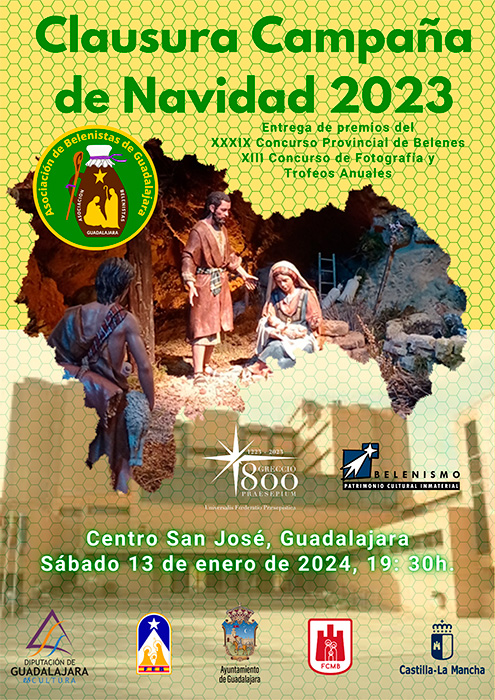 Este próximo sábado día 13 de enero, tendrá lugar el acto de entrega de premios del XXXIX Concurso Provincial de Belenes, así como del XIII Concurso de Fotografía «Antonio Garcia Alejandre». Este mismo acto sirve de clausura a la Campaña de Navidad 2023, por lo que estarán presentes las autoridades de Guadalajara. Es destacable la dificultad que este año ha encontrado el Jurado para fallar el Concurso de Belenes dada la calidad en ascenso que está viviendo el belenismo de Guadalajara y que refleja el buen estado de salud del mismo.