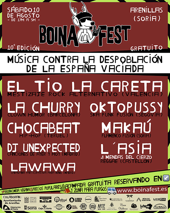 Este sábado 10 de agosto se celebrará la 10ª edición del Boina Fest en Arenillas (Soria). Un pequeño municipio del sur de Soria de apenas 50 habitantes conocido por su lucha contra la despoblación y en donde, tras 9 ediciones en constante crecimiento, se espera una asistencia superior a la de años anteriores, rondando las 1200 personas. La cita comenzará por la tarde, a las 17h, y se alargará hasta las 5h de la mañana. Estos son los artistas que actuarán: