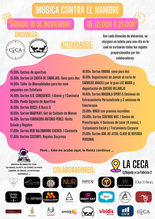 Este sábado tendrá lugar el evento musical-solidario “Música contra el hambre”organizado por el Banco de Alimentos de CuencaEl sábado 16 de noviembre todos los Conquenses están invitados a esta divertida jornada en el Bar La Ceca (c/Bajada Fabrica n.º 2) donde la música y la solidaridad se unen para darle a la “Gran Recogida de Alimentos” del Banco de Alimentos de Cuenca el pistoletazo de salida.