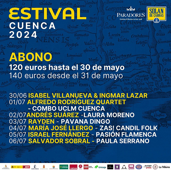 PATROCINADORES. El núcleo de patrocinadores de Estival Cuenca 24 se integra, por el momento por Solán de Cabras, Parador de Cuenca, Consorcio Ciudad de Cuenca, INAEM, Junta de Comunidades de Castilla-La Mancha, Fundación Globalcaja Cuenca, Universidad de Castilla-La Mancha, Patronato Universitario Gil de Albornoz, UIMP, Unicaja, Pub Los Clásicos, Espacio Torner, CMMPlay, Harinas Félix Saiz, Catedral de Cuenca, Europa Press y La Tribuna de Cuenca. Sigue abierta la posibilidad de contribuir a la 13ª edición del festival internacional conquense.