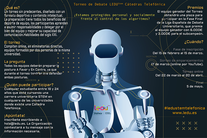 El Torneo se desarrollará telemáticamente y podrá participar cualquier estudiante con edades comprendidas entre 18 y 24 años que curse una carrera universitaria STEM de las universidades que cuentan con Cátedra de Telefónica, como la de Castilla-La Mancha. Los equipos debatirán sobre la pregunta ¿Estamos protegidos personal y socialmente frente al control de los algoritmos?