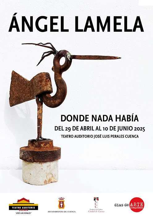 Dentro del proyecto “días de ARTE CONQUENSE”, programado desde la Concejalía de Cultura del Ayuntamiento de Cuenca, dirigido por María Ángeles Martínez y coordinado por Carlos Codes, contamos en esta ocasión con la exposición de escultura y materiales encontrados de Ángel Lamela desde el 29 de abril al 10 de junio en la sala de exposiciones del Teatro Auditorio de Cuenca.