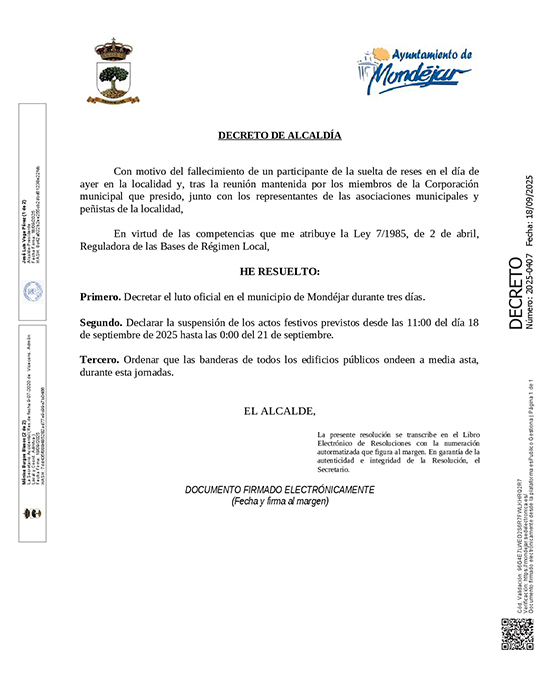 El Ayuntamiento de Mondéjar ha decretado tres días de luto oficial una vez reunidos los miembros de la Corporación Municipal, junto con los representantes de las asociaciones municipales y peñistas de la localidad.