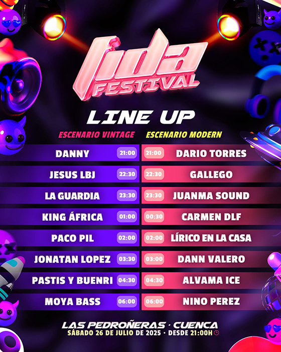 FIDA FESTIVAL tendrá lugar, desde las 21.00h, en el Recinto Piscina de Las Pedroñeras. Serán más de nueve horas de fiesta ininterrumpida en las que, en dos escenarios habilitados al efecto, pasarán más de 15 artistas nacionales e internacionales con el mejor sonido del momento: reguetón, trap, remember, electrónica, dance, hardcore, pop-rock, etc.
