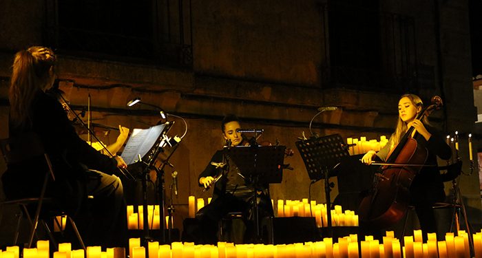 Después de haber actuado ya en alguna ocasión anterior en la villa agallonera, interpretando su repertorio de bandas sonoras del cine, anoche interpretaron un concierto didáctico, agrupado por periodos musicales, de obras muy conocidas. Con una puesta en escena muy cuidada, en la que el escenario aparece lleno de velas que van cambiado su color e iluminación, el concierto arrancaba con el Canon de Pachelbel.