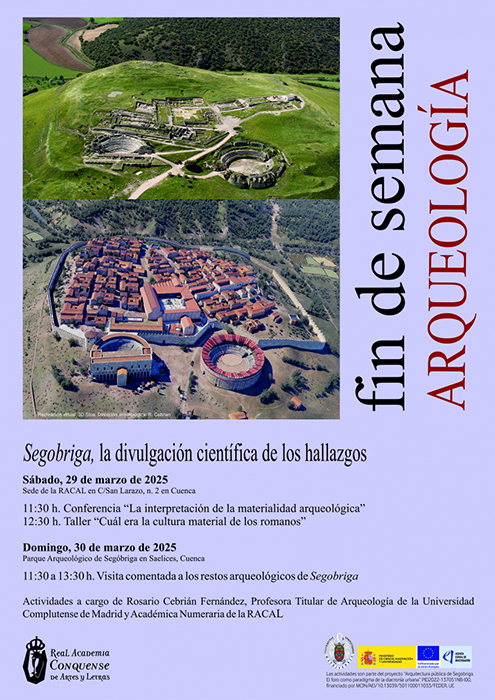 La jornada del sábado 29 se abrirá a las 11,30 horas en las dependencias de la corporación académica, en la última planta del edificio de las antiguas Escuelas de San Antón en Cuenca capital, con una charla sobre “La interpretación de la materialidad arqueológica” a la que seguirá, a las 12,30, un taller organizado bajo el título de “Cuál era la cultura material de los romanos”, ambas actividades de entrada libre y gratuita. Y el domingo la cita se traslada al propio yacimiento para realizar, entre las 11,30 y las 13,30, una visita comentada a sus restos arqueológicos.