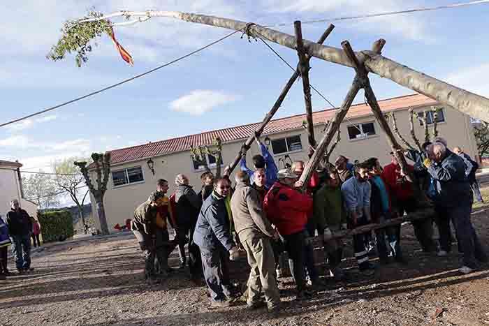 En el mismo centro del Corralón esperaba un agujero tremendo, “siempre exagerado, para que no se caiga”, seguía José Luis Rivas, que iba a servir de cimiento al palo. Después de ponerlo en posición, los fuentenovilleros comenzaron a izarlo. Dirigiendo la operación estaba, naturalmente, el propio José Luis. Tardaron catorce minutos en hacerlo. Y se sirvieron para ello de las mismas cabrillas de las con las que lo habían transportado. Además, tres grupos de fuentenovilleros tiraban de sogas en tres direcciones distintas para ayudar a mantener el equilibrio del mayo mientras se izaba. “Este año ha sido más fácil, porque tiene menos volumen que otros”, valoraba el veterano.