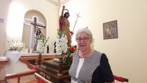 En el interior de la iglesia parroquial, que hace años se abría por dentro con grietas como diaclasas, Juana Alcalde acaba de sentarse en un banco seguro porque, como dice, el de delante tiene clavos que rompen la falda. Cuando era pequeña, celebrábamos la fiesta con la misa, la procesión y el baile. Había baile con acordeón, sólo un acordeonista. Yo tenía 5 o 6 años e, incluso de moceta, también había baile con acordeón. Tocaban en lo que hoy es un solar pero que, entonces, era un salón. Ahora hay muchos solares porque se han ido hundiendo edificios como el horno. Se hundió solo. Era el que a mitad del siglo 19 mantenía el pueblo.