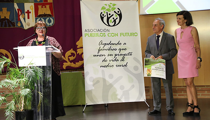 La gerente de la Fundación Eurocaja Rural, Susana Cortés Martínez, recogió este reconocimiento de manos del tesorero y la vicepresidenta de la Asociación Pueblos con Futuro, José Luis Gallo y Ana Gutiérrez, respectivamente. En su intervención, Cortés Martínez felicitó a esta asociación por la labor que desarrolla, por los proyectos sólidos, serios y de garantías que promueves y por compartir la misma pasión que Fundación Eurocaja Rural luchando contra la despoblación e impulsando el desarrollo rural, ejecutando acciones sociales transformadoras para que los municipios prosperen.