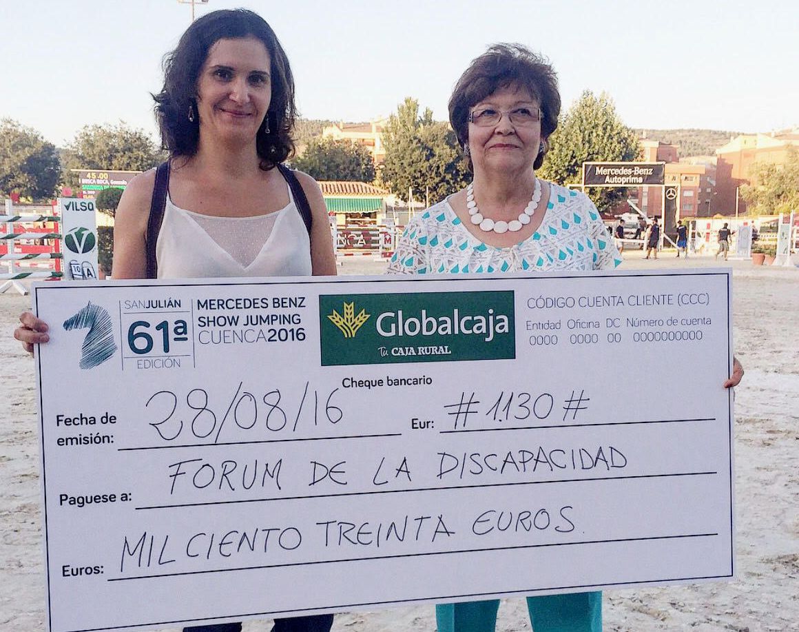 Isolina Martínez, presidenta del Fórum de Discapacidad de Cuenca ha recogido, de manos de Henar de la Sierra, representante de la Fundación Globalcaja, el cheque con la recaudación conseguida durante los días del Concurso, considerado como el segundo más importante de España, en afluencia de público y apuestas.