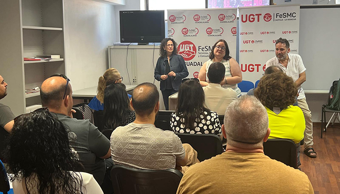 FeSMC UGT ha celebrado hoy en su sede en Guadalajara la Asamblea abierta “Migrar no resta derechos” en la que el responsable confederal de Migraciones de UGT, Cesc Poch; junto a la compañera del área, Ana María Corral; han informado a la ciudadanía de asuntos tan importantes como el nuevo Reglamento de la Ley de Extranjería que entró en vigor el pasado 20 de mayo, o la situación laboral de las personas migrantes. Así como la defensa y protección del derecho a asilo y a la movilidad humana, obligada o voluntaria, como una prioridad en la sociedad actual.