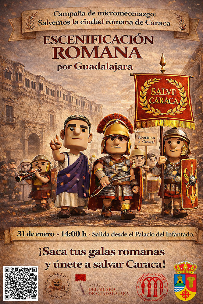 El Palacio del Infantado en Guadalajara será el escenario este sábado 31 de enero de una espectacular actividad de recreación histórica en el marco de la campaña de micromecenazgo «Salvemos la ciudad romana de Caraca», impulsada por el Ayuntamiento de Driebes. La iniciativa busca recaudar fondos para adquirir los terrenos privados donde se asienta este valioso yacimiento arqueológico declarado Bien de Interés Cultural.