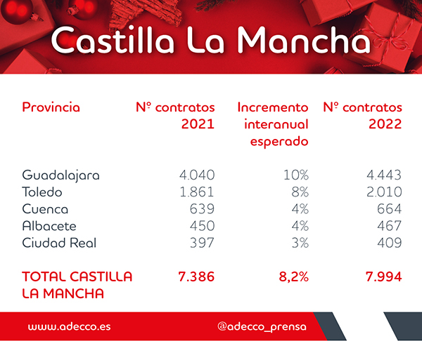 En el caso castellanomanchego, el incremento esperado es algo mayor, de un 8,2%, con la firma de casi 8.000 contratos (es la octava región donde se espera más empleo).