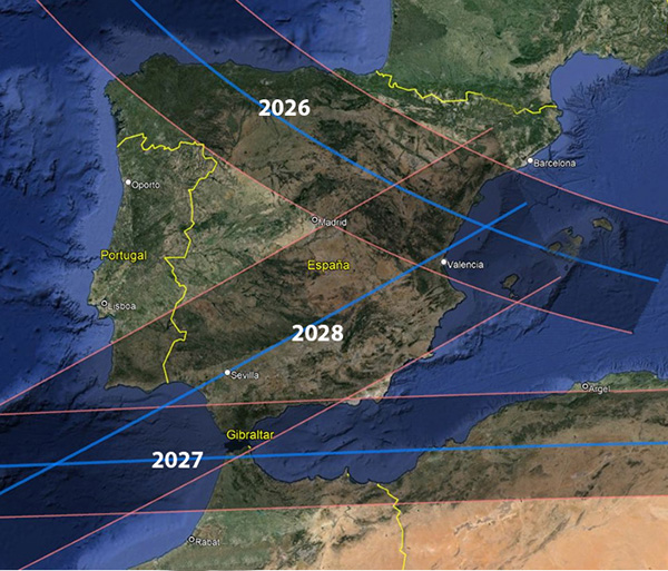 En los años posteriores, disfrutaremos de otros dos eclipses solares. El 2 de agosto de 2027 tendrá lugar otro eclipse solar total, con una duración excepcional (casi 7 minutos) que en España, será visible desde la costa sur andaluza, las ciudades autónomas de Ceuta y Melilla y las Islas Canarias. Y el 2 de enero de 2028 volveremos a disfrutar de un eclipse, en este caso anular, visible en una franja que atravesará España de suroeste a noreste.