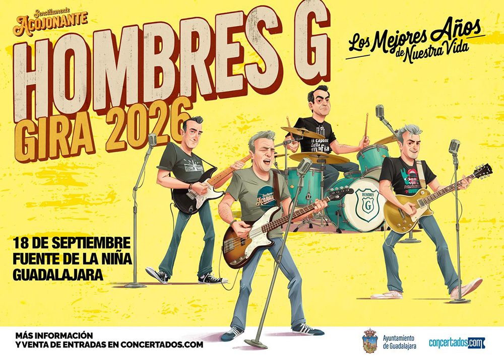 El Ayuntamiento de Guadalajara anuncia que Hombres G, referente indiscutible del pop-rock español, incluirá nuestra ciudad en su gira “Los Mejores Años de Nuestra Vida 2026”, que recorrerá las principales ciudades y festivales del país. La cita será el 18 de septiembre, viernes de las Ferias y Fiestas, en el Estadio Fuente de la Niña, un espacio que se consolida como escenario de grandes conciertos.