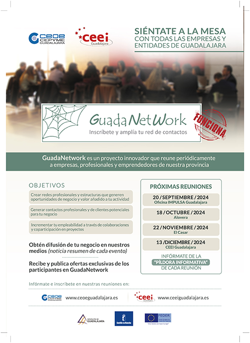 Un proyecto, GuadaNetWork, creado conjuntamente entre CEOE-CEPYME Guadalajara y el CEEI alcarreño, con la colaboración de la Diputación provincial de Guadalajara y la Junta de Comunidades de Castilla-La Mancha, así como los ayuntamientos de las localidades donde se celebran los encuentros.