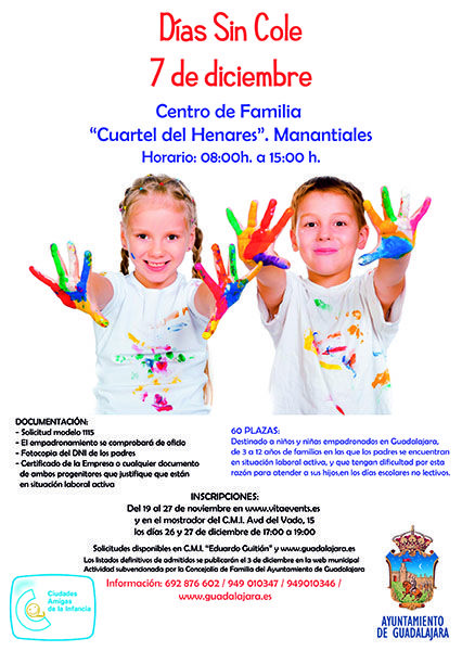 De cara al próximo puente de la Constitución, con un viernes laborable no lectivo entre fiesta y fiesta, la Concejlía de Familia del Ayuntamiento de Guadalajara tiene operativo el programa Días sin Cole, que se activa para ayudar a las familias con hijos en edad escolar a conciliar la vida laboral y familiar.