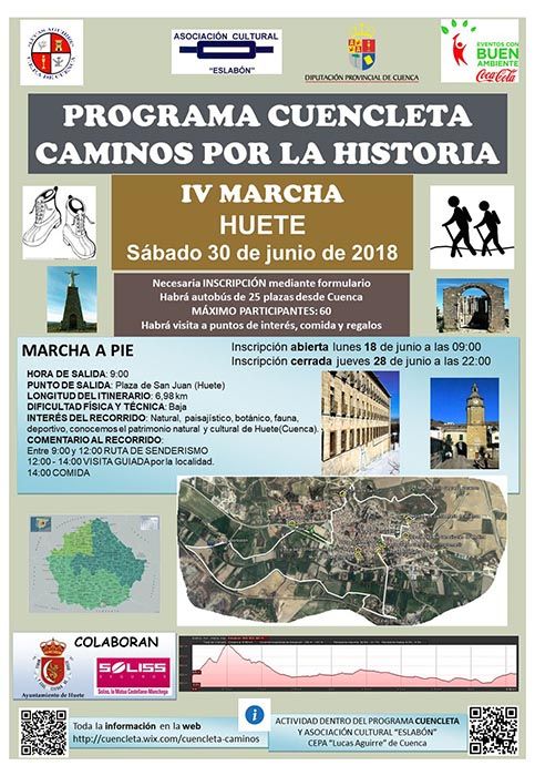El próximo sábado 30 de junio la ciudad de Huete acogerá la cuarta marcha saludable del programa “Caminos por la Historia“, que organiza la Asociación Cultural “Eslabón” con el patrocinio de la Diputación Provincial de Cuenca.