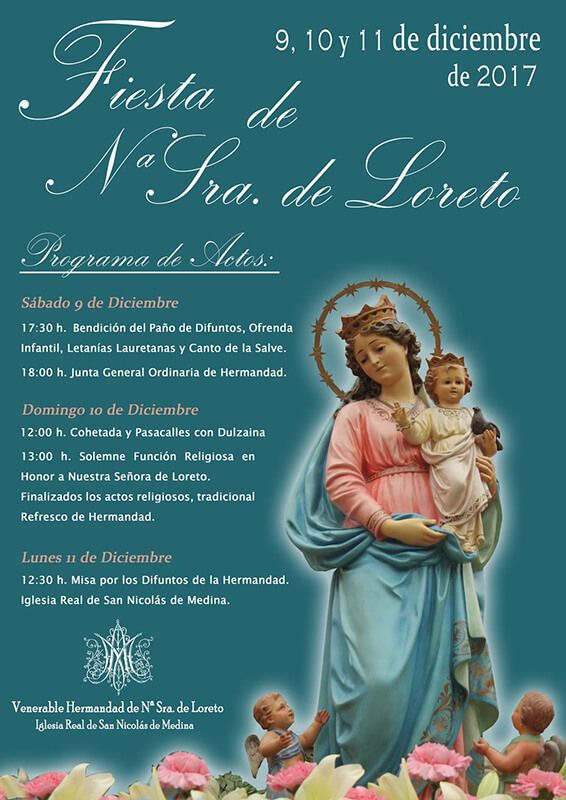 Huete celebrará el lunes la festividad de la Virgen de LoretoEl próximo domingo 10 de diciembre se celebrará la festividad de Ntra. Sra. de Loreto en la Iglesia Real de San Nicolás de Medina. La Solemne Función Religiosa en honor de la titular será a las 13:00 horas, realizándose una cohetada y pasacalles de dulzaina y tambor previamente.