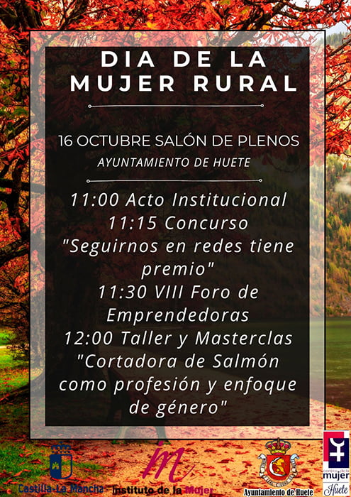 El lunes 16 de octubre el Ayuntamiento de Huete y el centro de la mujer celebrarán el Día Internacional de las Mujeres Rurales, con un acto institucional que comenzará a las 11:00 horas en el Salón de Plenos del Ayuntamiento, seguidamente se celebrará el VIII Foro Emprendedoras en el Medio Rural, concurso “seguirnos en redes tiene premio”, terminando con un taller y masterclass de cortadora de salmón como profesión a mostrar.