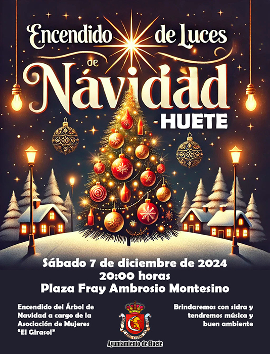 Huete encenderá las luces de Navidad este sábado 7 de diciembre03Este sábado 7 de diciembre se procederá al encendido de la iluminación navideña y Árbol de Navidad en la Plaza Fray Ambrosio Montesino a las 20:00 horas. Este año el encendido de la iluminación navideña correrá a cargo de la Asociación de Mujeres “El Girasol”, en su 40º aniversario como asociación activa en Huete y en reconocimiento a su extensa trayectoria desde que se constituyesen como Asociación de Amas de Casa.