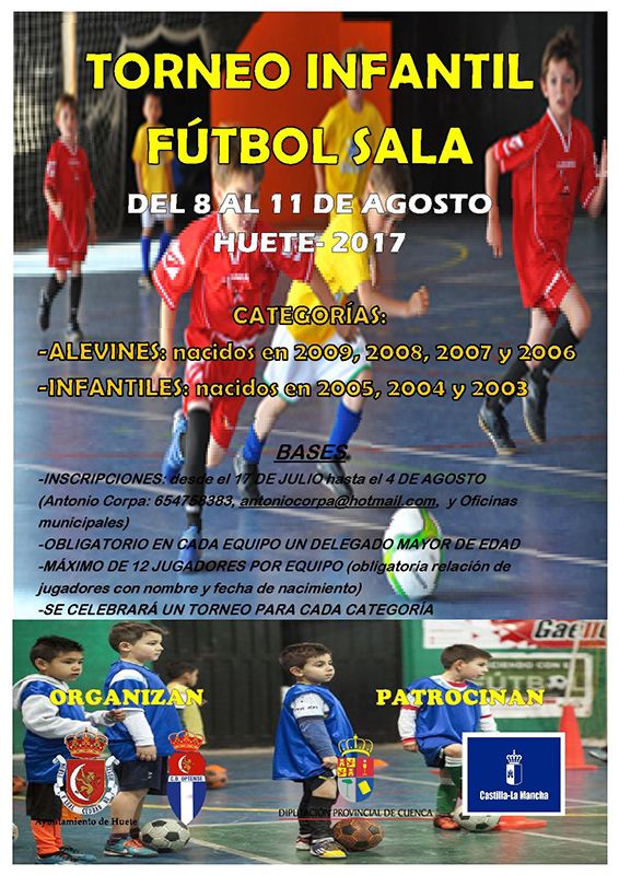 Huete organiza su Torneo Infantil de Fútbol-Sala 2017Este lunes 17 de julio se abre el plazo para inscribirse al Torneo Infantil de Fútbol-Sala organizado por el Ayuntamiento de Huete y que se celebrará del 8 al 11 de agosto, para categorías de alevines e infantiles, que comprende a chicos de edades comprendidas entre 7 a 14 años.