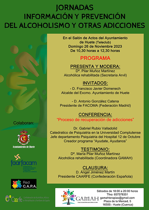 El Salón de Actos del Ayuntamiento de Huete acogerá el domingo 26 de noviembre a las 10:30 horas las Jornadas de Información y Prevención del Alcoholismo y otras Adicciones, jornadas que se celebran con motivo de la creación del Grupo de Ayuda Mutua para Adictos en Huete (GAMAH).