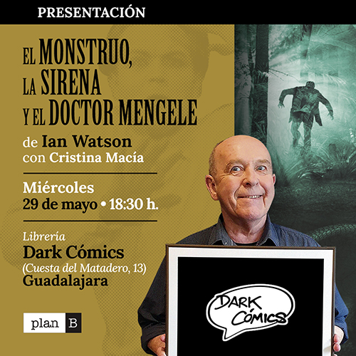 El próximo miércoles 29 de mayo, a partir de las 18:30, el autor Ian Watson acompañado por Cristina Macía presentará en la librería Dark Cómics de Guadalajara su última novela, titulada El monstruo, la sirena y el doctor Menguele, publicada por Plan B en nuestro país.
