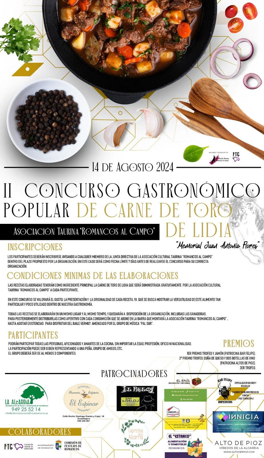 Tras el éxito de la I edición, celebrada el año pasado, tanto en participación como en creación de innovadoras recetas, la Asociación Cultural Taurina “Romancos al Campo” se complace en presentarles la II edición del Concurso Gastronómico Popular de Carne de Toro de Lidia “Romancos al campo” en memoria de D.Juan António Flores, “El Camarada”, gran amigo de la asociación y de Romancos que recientemente nos dejó y que siempre estuvo muy vinculado a la realización de la tradicional caldereta de toro de fin de fiestas de Romancos, siendo socio de la Asociación Cultural Taurina «Romancos al Campo» y miembro del jurado de la l Edición del Concurso Gastronómico popular de carne de toro de lidia “Romancos al campo”. El evento tendrá lugar en el parque de la Iglesia de Romancos el próximo miércoles 14 de agosto.Este parque, con su frondosa vegetación, es un oasis de frescura enclavado en mitad de la Alcarria y que se situa frente a la Iglesia de Nuestra Señora de la Asunción, un magnífico ejemplo de “Gótico isabelino” que data de finales del siglo XIV y principios del siglo XV, en pleno reinado de los Reyes Católicos. El programa diseñado por la organización para este día tan especial,que combina gastronomía, amistad,tradicion y tauromaquia, es el siguiente: