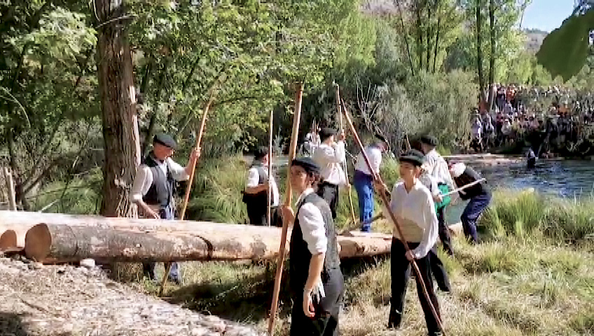 La fiesta continuaba ayer, viernes, con la presentación oficial de la XXIX Fiesta Ganchera en la Plaza de la Taberna seguida de la entrega de premios del concurso fotográfico 2024 y de la proyección del documental “Los pastores del bosque flotante” y, hoy sábado, desde la nueve de la mañana, tras la concentración de gancheros, pasacalles con dulzaineros Mirasierrra y la tradicional degustación de aguardiente y rollletes en Plaza de la Fuente, la comitiva de gancheros y público, que por cierto ha sido acogido en la otra margen del río, se ha desplazado hasta el Tajo en donde comenzó, sobre las once de la mañana, la demostración de oficio de ganchería en el río Tajo.