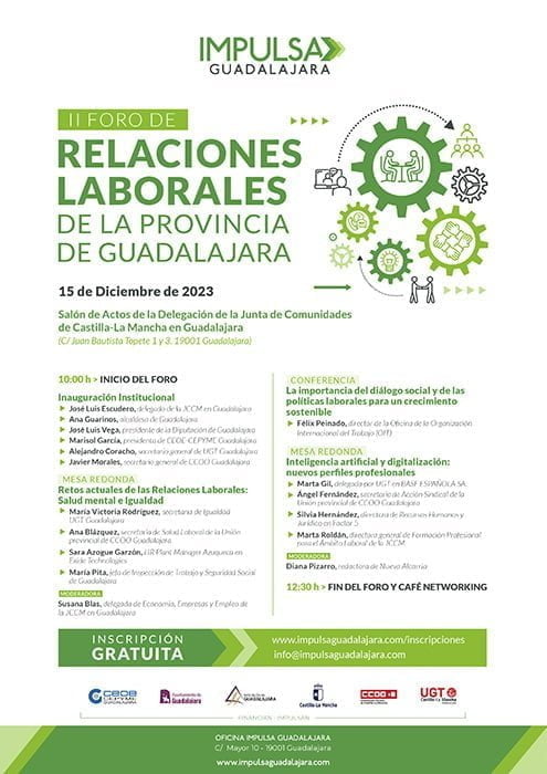 El Salón de Actos de la Delegación de la Junta de Comunidades de Castilla-La Mancha en Guadalajara acogerá la segunda edición del Foro de Relaciones Laborales de la Provincia de Guadalajara, el próximo 15 de diciembre a las 10:00 horas. Un foro que se enmarca en el proyecto ‘Impulsa Guadalajara’, iniciativa promovida por CEOE-CEPYME Guadalajara, la Diputación Provincial, el Ayuntamiento de Guadalajara y la Junta de Comunidades de Castilla-La Mancha, así como los sindicatos CCOO y UGT. Dicho foro confirma la apuesta de todas las instituciones colaboradoras por seguir reforzando el diálogo social y el crecimiento sostenible en nuestra provincia.