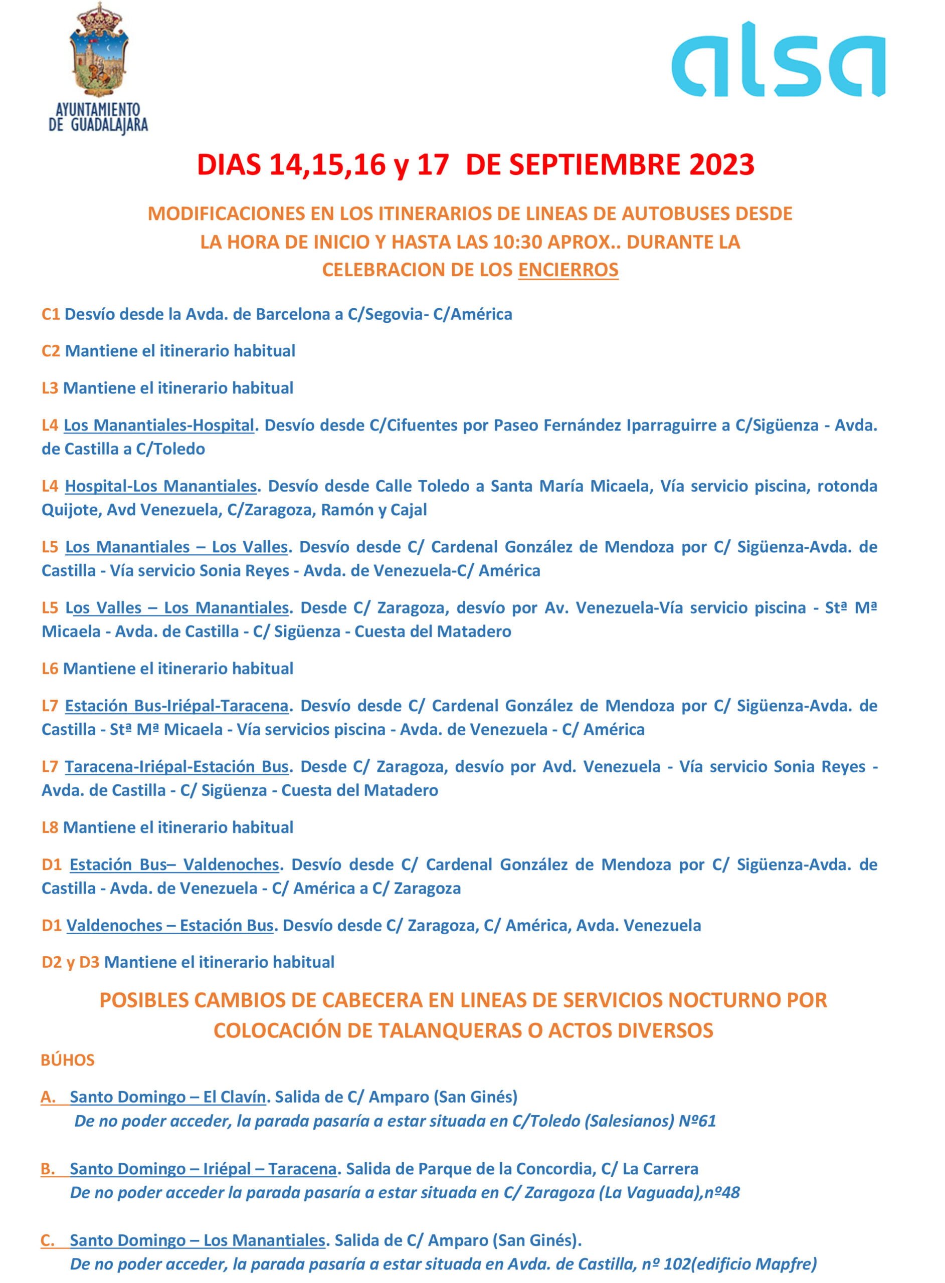 Se adjunta documento relativo a las posibles modificaciones en los itinerarios de líneas de autobuses desde la hora de inicio y hasta las 10:30h aproximadamente, durante la celebración de los encierros. También posibles cambios de cabecera en líneas de servicios nocturnos por colocación de talanqueras o actos diversos.