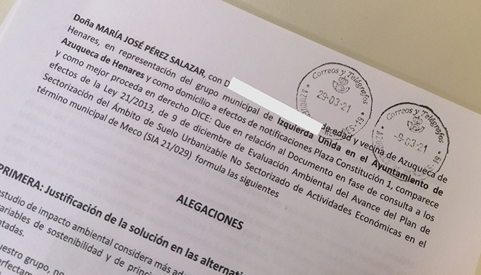 IU Azuqueca presenta sus alegaciones al documento de evaluación ambiental del proyecto ALMAEn el último Pleno los distintos grupos políticos fueron conocedores de que el Gobierno de Blanco estaba preparando alegaciones al documento que se encontraba en fase de consulta, a los efectos de la Ley 21/2013, de 9 de diciembre de Evaluación del Avance del Plan de Sectorización del ámbito de Suelo Urbanizable No Sectorizado de Actividades Económicas del término municipal de Meco.