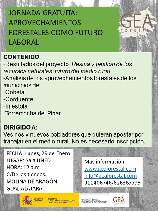 El próximo lunes 29 de Enero, a las 12 a.m. se llevará a cabo en Molina de Aragón, una jornada en la que se expondrán los resultados del proyecto. Está dirigida principalmente, a vecinos de la zona y otros interesados que quieran trabajar en el sector forestal y conocer su posibilidad como futuro laboral.