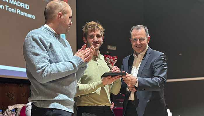 Tras su pregón, Jota Linares ha recibido el premio Tormo Negro-Masfarné, dotado con 1.500 euros, de la mano de Antonio López, gerente de la compañía conquense de material eléctrico que patrocina este galardón.