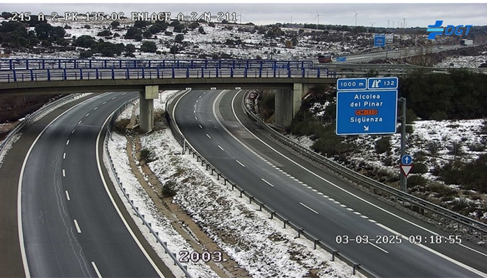 La autovía A-2 ha permanecido cortada durante la pasada madrugada en el kilómetro 135 a la altura de Alcolea del Pinar por problemas con la circulación, debido a la presencia de nieve, en la provincia de Soria. Se restablecía de nuevo el paso de turismos alrededor de la 1:30 y a partir de las 2:00 el paso de vehículos pesados.