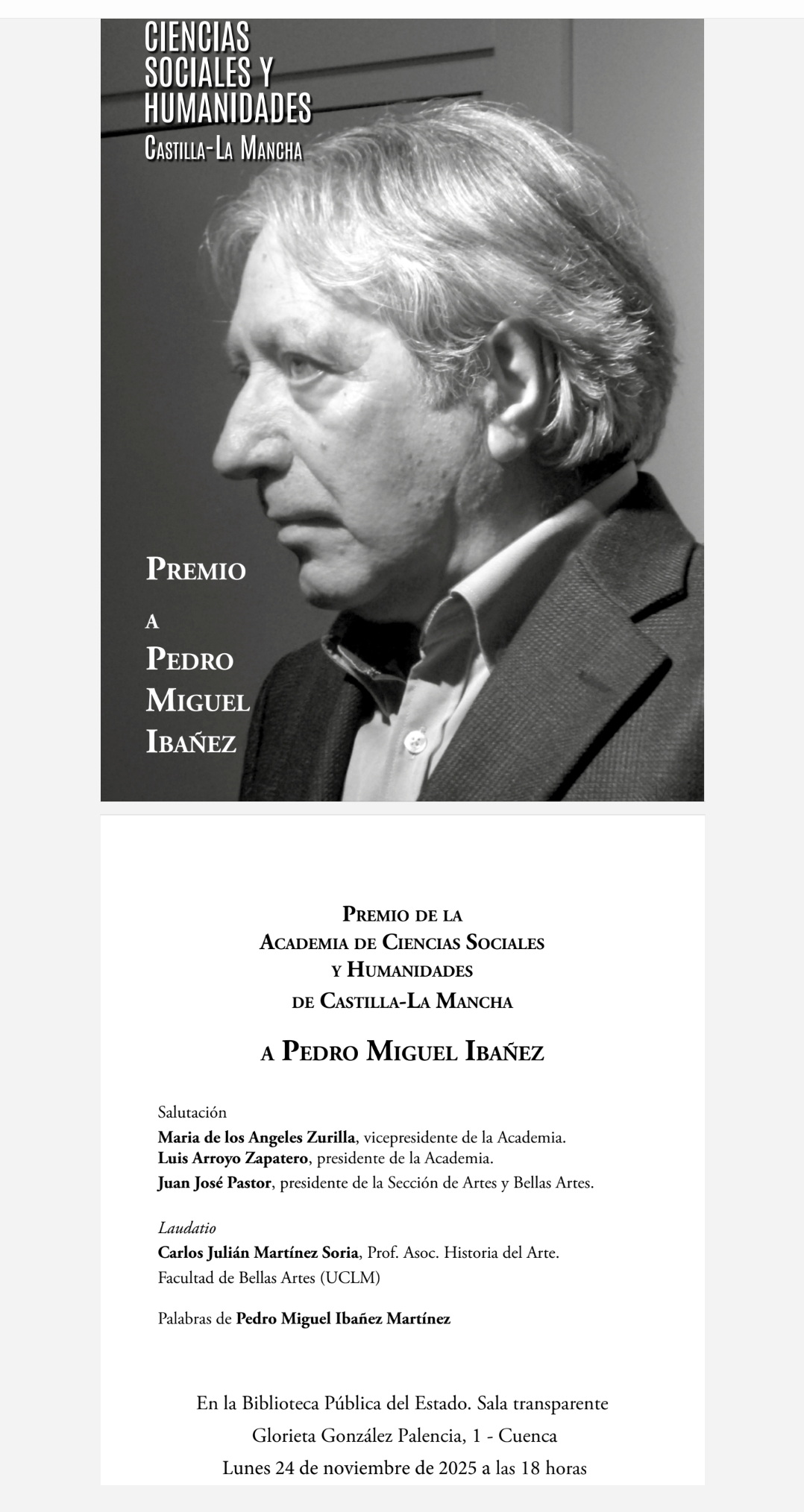 El próximo lunes 24 del presente mes de noviembre la llamada sala transparente de la Biblioteca Pública del Estado en Cuenca prestará marco, a partir de las seis de la tarde, a la entrega a nuestro compañero de corporación el historiador del Arte Pedro Miguel Ibáñez del Premio a su labor investigadora que le ha otorgado la Academia de Ciencias Sociales y Humanidades de Castilla-La Mancha. La correspondiente Laudatio estará a cargo del profesor de la Facultad de Bellas Artes de la UCLM Carlos Julián Martínez Soria.