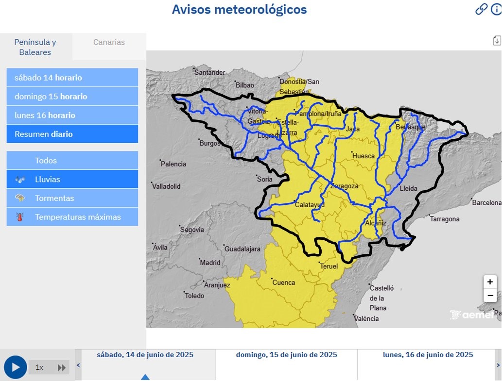 Ante los avisos amarillos de AEMet por posibles lluvias intensas (de hasta 15 l/m² en 1 hora) en la zona central de la cuenca del Ebro, la Confederación Hidrográfica del Ebro intensifica la vigilancia y recuerda la posibilidad de crecidas súbitas importantes de carácter local en barrancos y cauces menores de todo el territorio navarro y aragonés, tanto en las zonas de montaña como en el valle del Ebro, así como en la zona norte de Guadalajara, principalmente en aquellas áreas donde descarguen los chubascos más intensos. Este aviso afecta a Navarra, Aragón (Zaragoza, Huesca y Teruel) y Castilla La Mancha (norte de Guadalajara) durante la segunda mitad de la jornada de hoy sábado 14/06. Desde la CHE se recomienda a los ciudadanos estar atentos a la evolución de los datos meteorológicos e hidrológicos en la Agencia Estatal de Meteorología www.aemet.es y en el SAIH Ebro www.saihebro.com , así como en esta página web www.chebro.es . En su caso, siempre seguir las recomendaciones de los Servicios de Protección Civil.