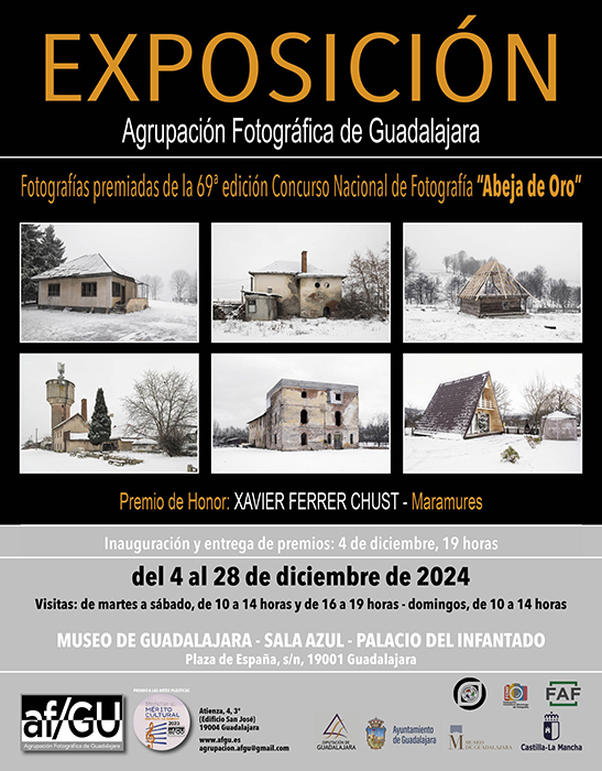 La Agrupación Fotográfica de Guadalajara nos presenta en esta ocasión las fotografías premiadas en su concurso “Abeja de Oro” en su última edición. El fotógrafo levantino Xavier Ferrer Chust se alzó con el Premio de Honor con una colección de fotografías en color titulada “Maramures”. En la sección de fotografías monocromas se hizo con el primer puesto Carlos Navarro Corberá con su colección de dípticos “Anatomía botánica”.