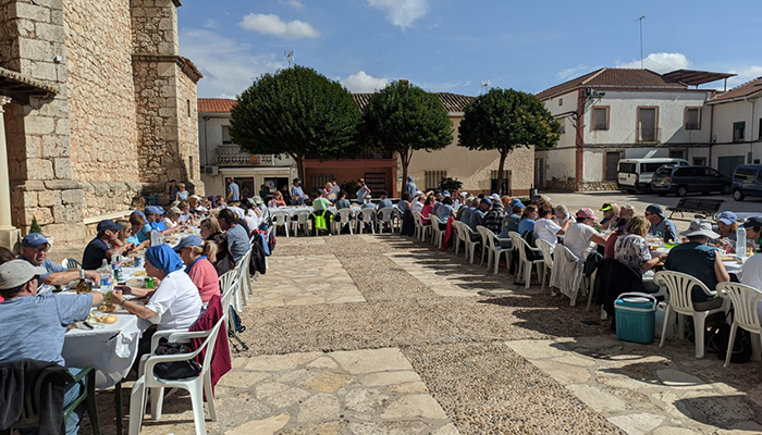 Después de una marcha de casi tres horas, la expedición regresó a la plaza donde les esperaba el servicio de catering que ellos mismos habían contratado para comer al aire libre en un ambiente festivo. El ayuntamiento cedió las infraestructuras necesarias, mesas y sillas  para que los participantes pudieran reunirse durante la comida, siempre respetando todas las medidas de seguridad antiCovid.