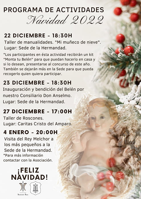 Las actividades comienzan este jueves, 22 de diciembre, con el Taller de manualidades ‘Mi muñeco de nieve’. Se desarrollará en la sede de la Hermandad a las 18:30 horas y está abierto a los hermanos más jovenes (hasta 12 años).