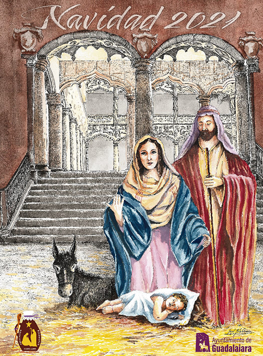 Como gran novedad, este año el cartel de Navidad de la Asociación no es una fotografía, sino una pintura, de Angel Malo Ocaña, que representa el Misterio en el zaguán del Palacio el Infantado.