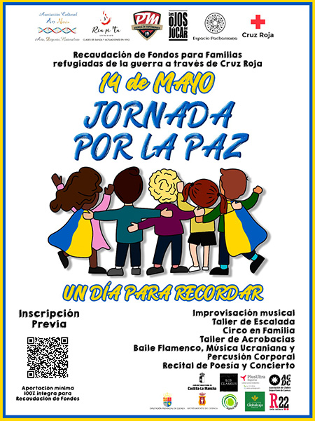 Comienza el día 13 con la presentación oficial y el primer taller artístico en Riá pi ta. Centro de arte y durante la jornada del día 14 tendremos todas las actividades en Espacio Pachamama, Ars Nova y en nuestra escuela de superhéroes (mirar la programación para ver los talleres). Terminando la jornada con un espacio musical organizado por Los Ojos del Júcar. Cinco entidades de la ciudad de Cuenca, más las entidades colaboradoras unen sus fuerzas para disfrutar de actividades por la mañana, por la tarde y también por la noche, con el bonito objetivo de ayudar a las personas que huyen de la guerra. El 100% integro de las aportaciones serán donadas a través de Cruz Roja.