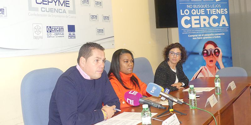 El vicepresidente de la Asociación de Comercio de Cuenca, José Luis Llandres, y la concejal de Comercio y Salud Pública del Ayuntamiento de Cuenca, Allady Rodríguez, han presentado esta iniciativa en la sede de CEOE CEPYME Cuenca, acompañados de la técnico de la Asociación del Comercio, Raquel Álvarez.
